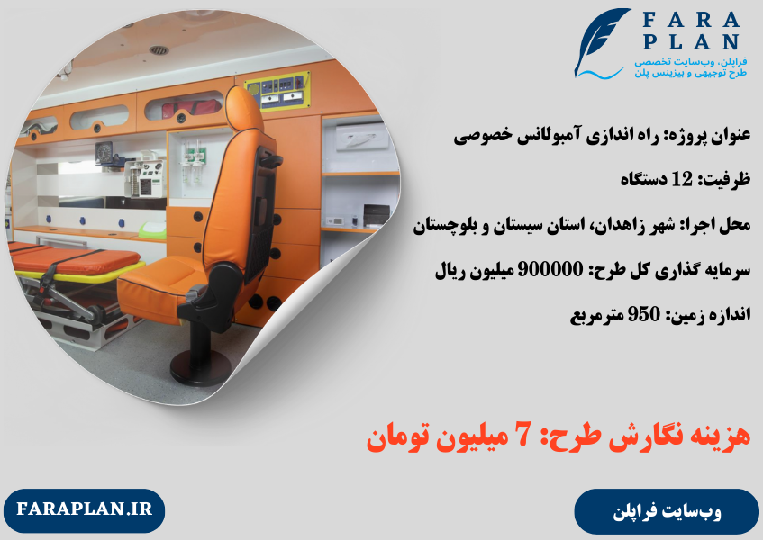 راهاندازی آمبولانس خصوصی در شهر زاهدان، استان سیستان و بلوچستان، بهعنوان یک طرح توجیهی اقتصادی و اجتماعی، فرصتی ارزشمند برای بهبود خدمات درمانی و ایجاد اشتغال محسوب میشود. این طرح که با ظرفیت 12 دستگاه آمبولانس طراحی شده است، پاسخگوی نیازهای پزشکی و اورژانس شهری و بینشهری در یکی از مناطق کمتر توسعهیافته کشور خواهد بود. با توجه به موقعیت جغرافیایی زاهدان و اهمیت خدمات اورژانس سریع، راهاندازی این مجموعه میتواند نقش حیاتی در افزایش کیفیت خدمات درمانی و کاهش زمان پاسخگویی به بیماران ایفا کند. میزان سرمایهگذاری ثابت این طرح 830,000 میلیون ریال و سرمایه در گردش آن 70,000 میلیون ریال برآورد شده است، که نشاندهنده مقیاس بزرگ و اهمیت اقتصادی این پروژه است.